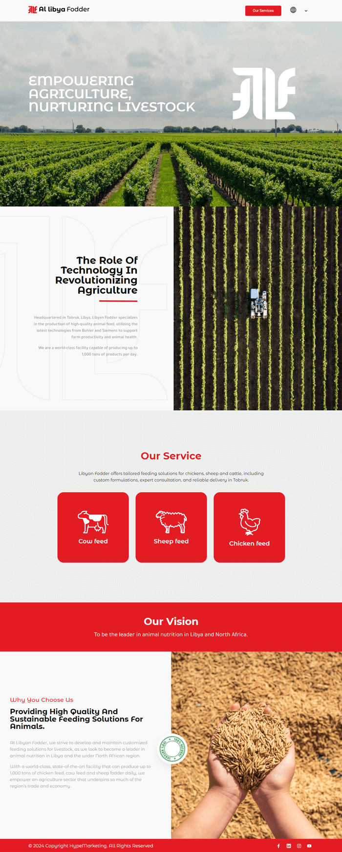 It was our pleasure working with Libyan Fodder to help them establish and grow their digital presence. Libyan Fodder is a world-class animal feed production facility headquartered in Tobruk, Libya, with a daily output capacity of up to 1,000 tons. Equipped with cutting-edge technology from Buhler and Siemens, the company supports farm productivity and animal health with scientifically formulated, high-quality feed. Libyan Fodder is a cornerstone of the agricultural and livestock supply chain in the region.