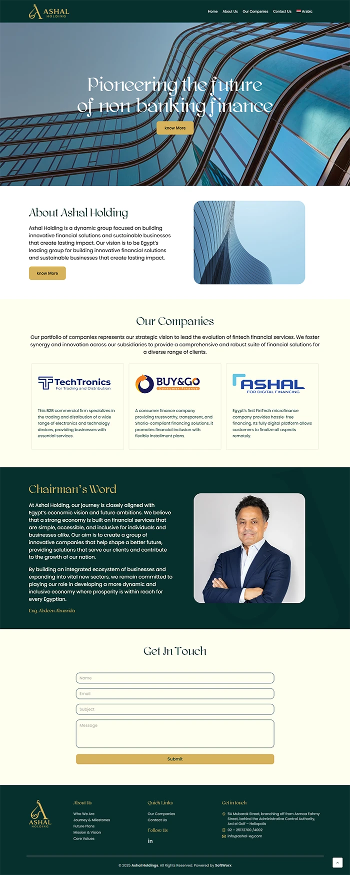 Ashal Holding is a dynamic group focused on building innovative financial solutions and sustainable businesses that create lasting impact. Our vision is to be Egypt’s leading group for building innovative financial solutions and sustainable businesses that create lasting impact. We achieve this by investing in and growing companies that make finance accessible, simple, and empowering. Under the supervision of the Financial Regulatory Authority (FRA), we operate as a strategic holding company with a primary focus on the non-banking financial sector, while also developing key strategic assets that support our core mission.